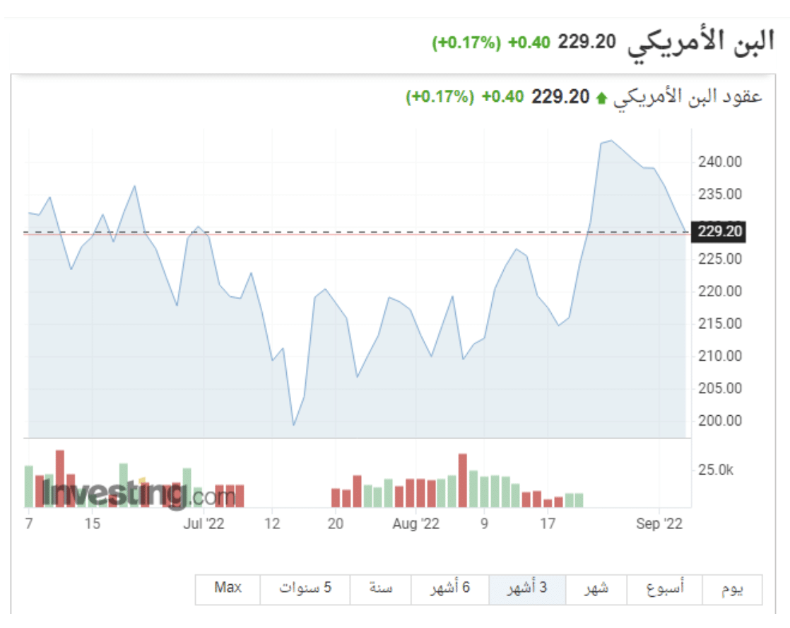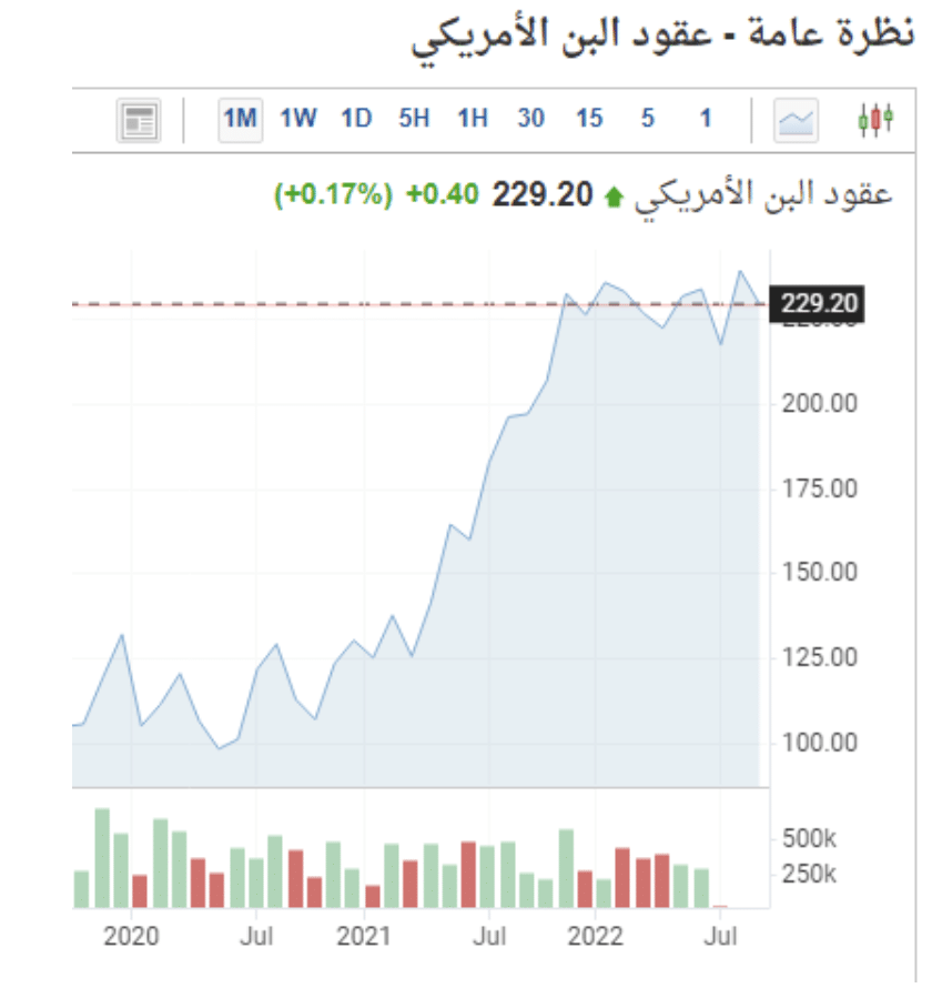 ويعرض الرسم البياني الثالث، حفاظ أسعار البن على ارتفاعها على الرغم من تذبذبها لتغلق البورصة أبوابها في آخر تاريخ يعرضه الرسم “6 سبتمبر 2022” بسعر 229.20 سنتًا للرطل الواحد.