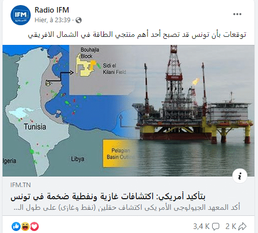 قادتنا المعطيات التي عثرنا عليها، لمنتدى على الإنترنت يضم ناشطين تونسيين، نقل ذات الخريطة ومعها تعليقات من قبِيلِ: “مؤامرة تحاك ضد تونس لسحب جزء كبير من مياهها الإقليمية الزاخرة بالغاز الطبيعي”، وكان آخر تحديث للموضوع بالمنتدى في يوم 31 يناير 2018.