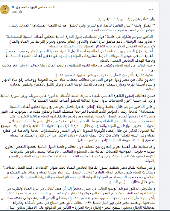 الأرقام ذاتها استعرضها الدكتور عبد العاطي، مرة أخرة، خلال سرد الموقف المائي المصري أثناء مشاركته في جلسة “الأمن المائي الحضري من أجل التنمية المستدامة” ضمن فعاليات “الأسبوع العربي الرابع للتنمية المستدامة”، يوم 14 فبراير 2022، وقال إن احتياجات مصر المائية تصل إلى 114 مليار مترًا مكعبًا سنويًا، يقابلها موارد مائية لا تتجاوز 60 مليار مترًا مكعبًا سنويًا، بعجز يصل إلى 54 مليار مترًا مكعبًا سنويًا.