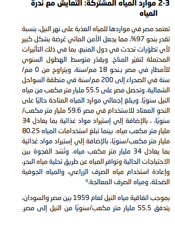 وبالبحث تبين أن الحكومة تسد الفجوة بين الاحتياجات الحالية والمتوفر من المياه عن طريق تحلية مياه البحر، وإعادة استخدام مياه الصرف الزراعي، والمياه الجوفية الضحلة، ومياه الصرف المعالجة.