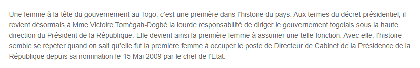 وفقًا للموقع الرسمي لرئاسة حكومة توجو، فإن السيدة ‘فيكتوار تيميغا’ تم اعتمادها رئيسة للحكومة منذ عام 2020.