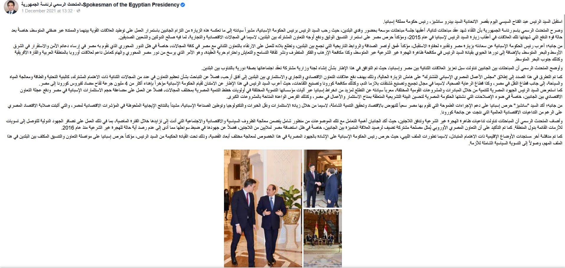 بيان وزارة التعاون الدولي وفي يوم 1 ديسمبر 2021، تم إطلاق مجلس الأعمال المصري الإسباني المُشترك، على هامش زيارة رئيس حكومة إسبانيا لمصر، وذلك بهدف دفع علاقات التعاون الاقتصادي والتجاري والاستثماري بين البلدين، وأكد الرئيس المصري عبد الفتاح السيسي وقتها أهمية العمل على مضاعفة حجم الاستثمارات الإسبانية في مصر ودفع عجلة التعاون الاقتصادي بين الجانبين، خاصةً في ضوء الإصلاحات التي دشنتها الحكومة المصرية لتحسين البيئة التشريعية المتعلقة بمناخ الاستثمار والأعمال في مصر.