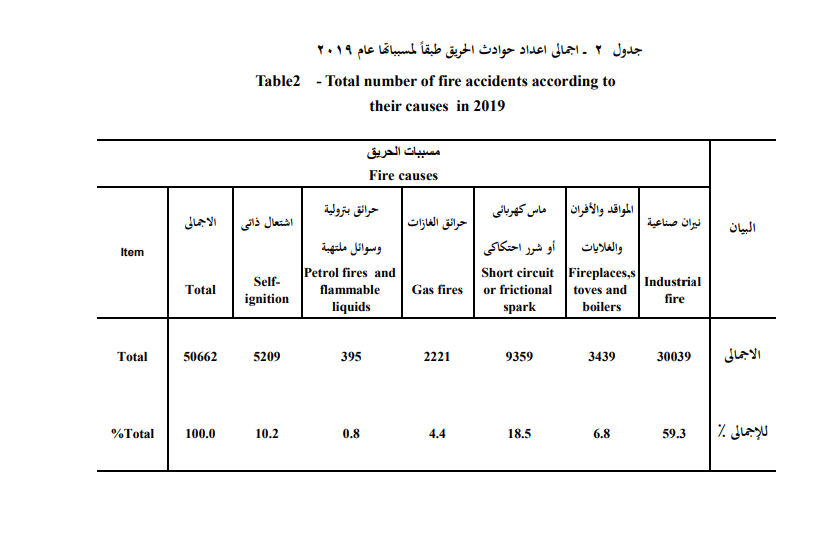 وفى عام 2019، أوضحت بيانات الإحصاء أن أهم المسببات الرئيسية للحـريق هو النيران الصناعية "أعقاب السجائر وأعواد الكبريت، والمواد المشتعلة، والشماريخ وغيرها" بعدد 30 ألفًا و39 حادثةً بنسبة 59.3%، والماس الكهربائي أو الشرر الاحتكاكي بعدد 9 آلاف و359 حادثةً بنسبة 18.5%.