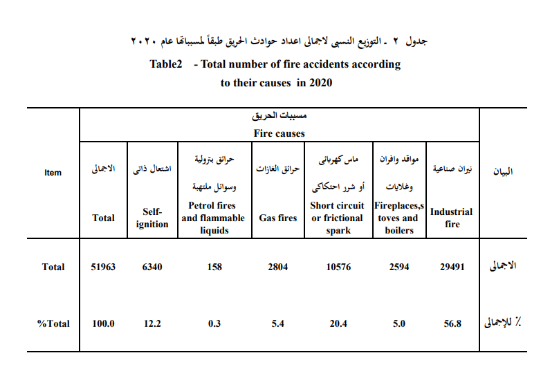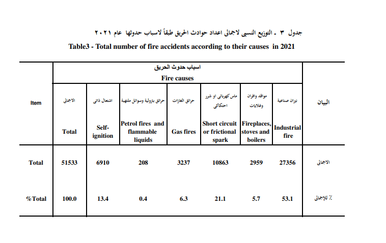 المركزي للإحصاء: المسببات الرئيسية للحريق عام 2021 النيران الصناعية بنسبة 53.1%، والماس الكهربائي بنسبة 21.1%.