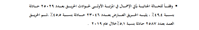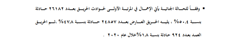 عام 2020، وفقًا للحالة الجنائية جاء الإهمال في المرتبة الأولى لحوادث الحـريق بعدد 26 ألفًا و182 حادثة بنسبة 50.4%، يليه الحـريق العارض بعدد 24 ألفًا و857 حادثةً بنسبة 47.8%، ثم الحـريق العمد بعدد 924 حادثةً بنسبة 1.8%.