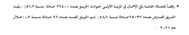 أوضحت بيانات المركزي للإحصاء، أن وفقًا للحالة الجنائية يأتي الإهمال في المرتبة الأولى لحوادث الحـريق بعدد 26 ألفًا و400 حادثة بنسبة 51.2%، يليه الحريق العارض بعدد 25 ألفًا و37 حادثةً بنسبة 48.6%، ثم الحريق العمد بعدد 96 حادثةً بنسبة 0.2% خلال عام 2021.
