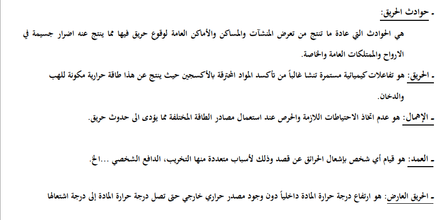 وأوضح أيضًا أن الحـريق العمد هو قيام أي شخص بإشعال الحرائق عن قصد وذلك لأسباب متعددة منها "التخريب والدافع الشخصي، إلخ"، فيما عرف الحريق العارض أنه ارتفاع درجة الحرارة المادة داخليًا دون وجود مصدر حراري خارجي حتى تصل درجة حرارة المادة إلى درجة اشتعالها.