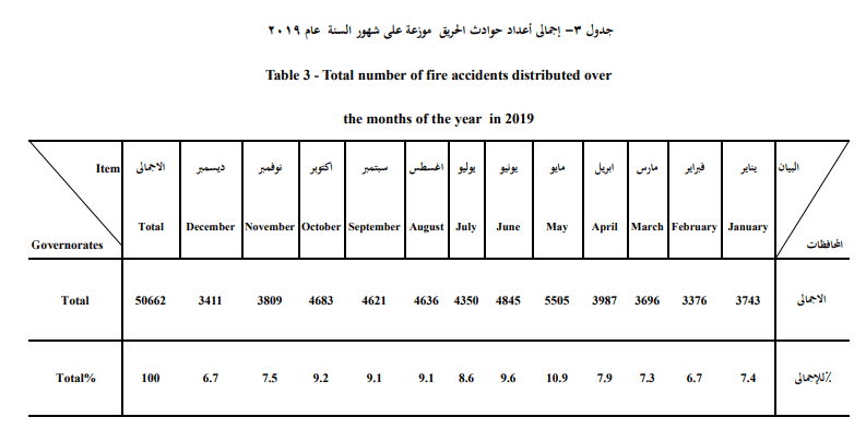 وفى عام 2019، سجل شهر مايو المرتبة الأولي لحوادث الحريق على مستوي شهور السنة بعدد 5 آلاف و505 حادثة بنسبة 10.9%، يليه شهر يونيو بعدد 4 آلاف 845 حادثة بنسبة 9.6% وأخيرًا شهري فبراير 3 آلاف و376 حادثة وديسمبر 3 آلاف و411 حادثة بنسبة 6.7% على التوالي من إجمالي حوادث الحريق.