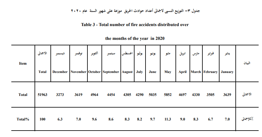 وفى عام 2020، سجل شهر مايو أيضًا المرتبة الأولي لحوادث الحريق على مستوي شهور السنة بعدد 5 آلاف و852 حادثة بنسبة 11.3%، يليه شهر يونيو بعدد 5 آلاف 35 حادثة بنسبة 9.7% وأخيرًا شهر ديسمبر 3 آلاف و273 حادثة بنسبة 6.3% من إجمالي حوادث الحريق