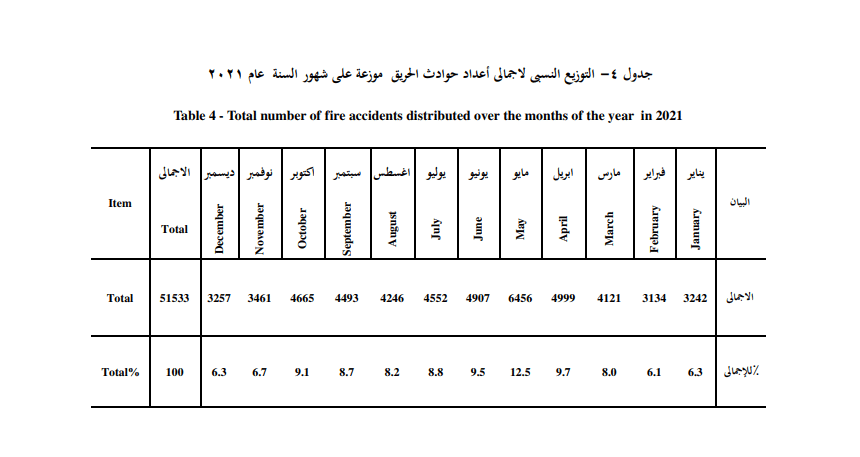 في عام 2021، سجل شهر مايو المرتبة الأولي لحوادث الحـريق على مستوي شهور السنة بعدد 6 آلاف و456 حادثة بنسبة 12.5%، يليه شهر ابريل بعدد 4 آلاف 999 حادثة بنسبة 9.7% وأخيرًا شهر فبراير 3 آلاف و134 حادثة بنسبة 6.1% من إجمالي حوادث الحـريق.