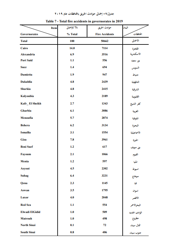 وفى عام 2019، جاءت محافظة القاهرة في المقدمة بحوادث الحريق بعدد 7 آلاف و114 حادثة بنسبة 14%، يليها محافظة الاسكندرية بعدد 3 آلاف و516 حادثة بنسبة 6.9%، وفى المرتبة الخيرة محافظة شمال سيناء بعدد 72 حادثة بنسبة 0.1% من إجمالي حوادث الحريق.