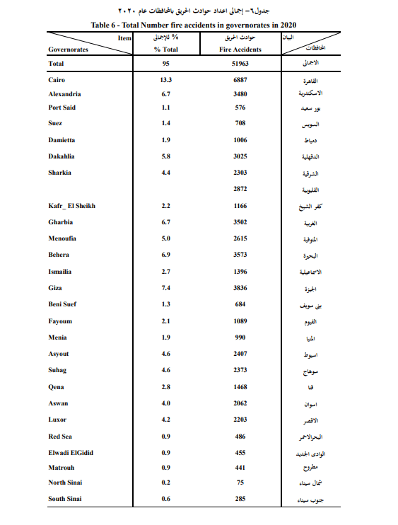 وفى عام 2020، جاءت محافظة القاهرة في المقدمة أيضًا بعدد 6 آلاف و887 حادثة بنسبة 13.3%، يليها محافظة الجيزة بعدد 3 آلاف و836 حادثة بنسبة 7.4%، وفى المرتبة الأخيرة محافظة شمال سيناء بعدد 75 حادثة بنسبة 0.2 % من إجمالي حوادث الحريق.