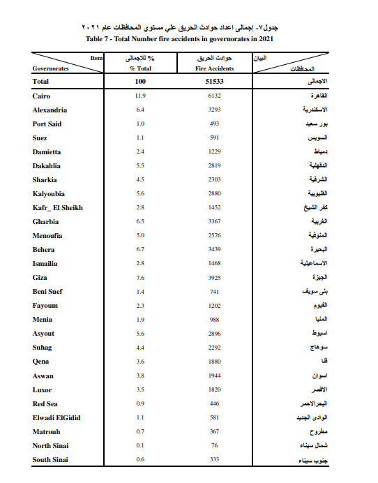 في عام 2021، جاءت محافظة القاهرة على مستوي المحافظات في المقدمة بحوادث الحريق بعدد 6 آلاف و132 حادثة بنسبة 11.9%، يليها محافظة الجيزة بعدد 3 آلاف و925 حادثة بنسبة 7.6%، وفى المرتبة الخيرة محافظة شمال سيناء بعدد 76 حادثة بنسبة 0.1% من إجمالي حوادث الحريق.