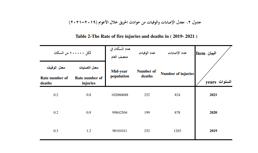 بلغ عدد المتوفين من ضحايا الحـريق نحو 252 متوفيًا وبلغ عدد المصابين 824 مصابًا عام 2021، مقابل 199 متوفيًا و868 مصابًا في عام 2020، وسجلت 252 متوفيًا و1203 مصابًا في عام 2019.