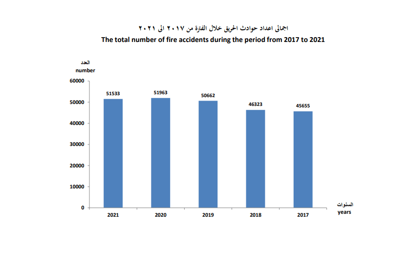 أوضح التقرير السنوي لحوادث الحـريق في مصر عام 2021، أن عدد حوادث الحريق على مستوى الجمهورية بلغ 51 ألفًا و533 حادثةً في عام 2021، مقابل51 ألفًا و963 حادثةً عام 2020، فيما بلغ 50 ألفًا و662 حادثةً عام 2019.