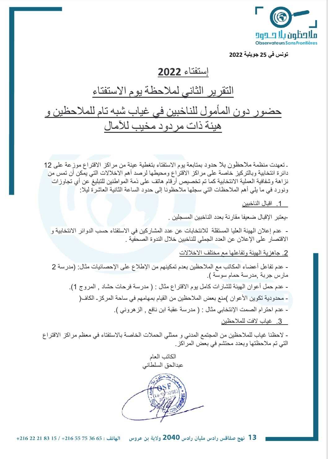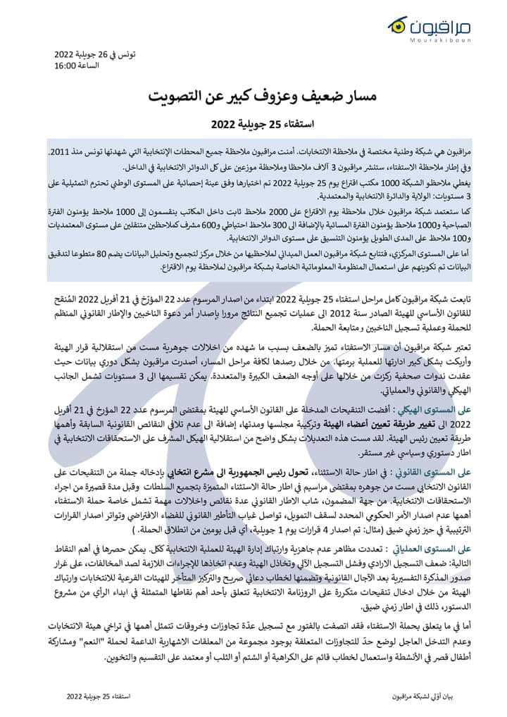 بيان منظمة مراسلون بلا حدود أما منظمة "مراقبون"، فأصدرت بيانًا يوم 26 يوليو 2022، وقدمت فيه مجموعة من الأرقام والبيانات أهمها أنها وضعت 3 آلاف ملاحظ من طرفها لمراقبة مسار يوم الاستفتاء، يغطون 1000 مكتب اقتراع داخل تونس، تم اختيارهم وفق عينة إحصائية على المستوى الوطني.