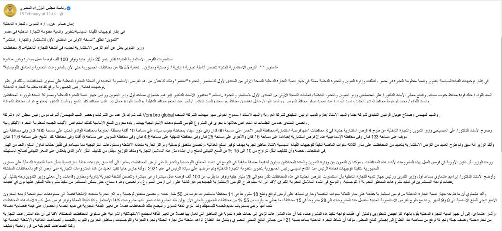 بيان وزارة التموين والتجارة الداخلية المصرية