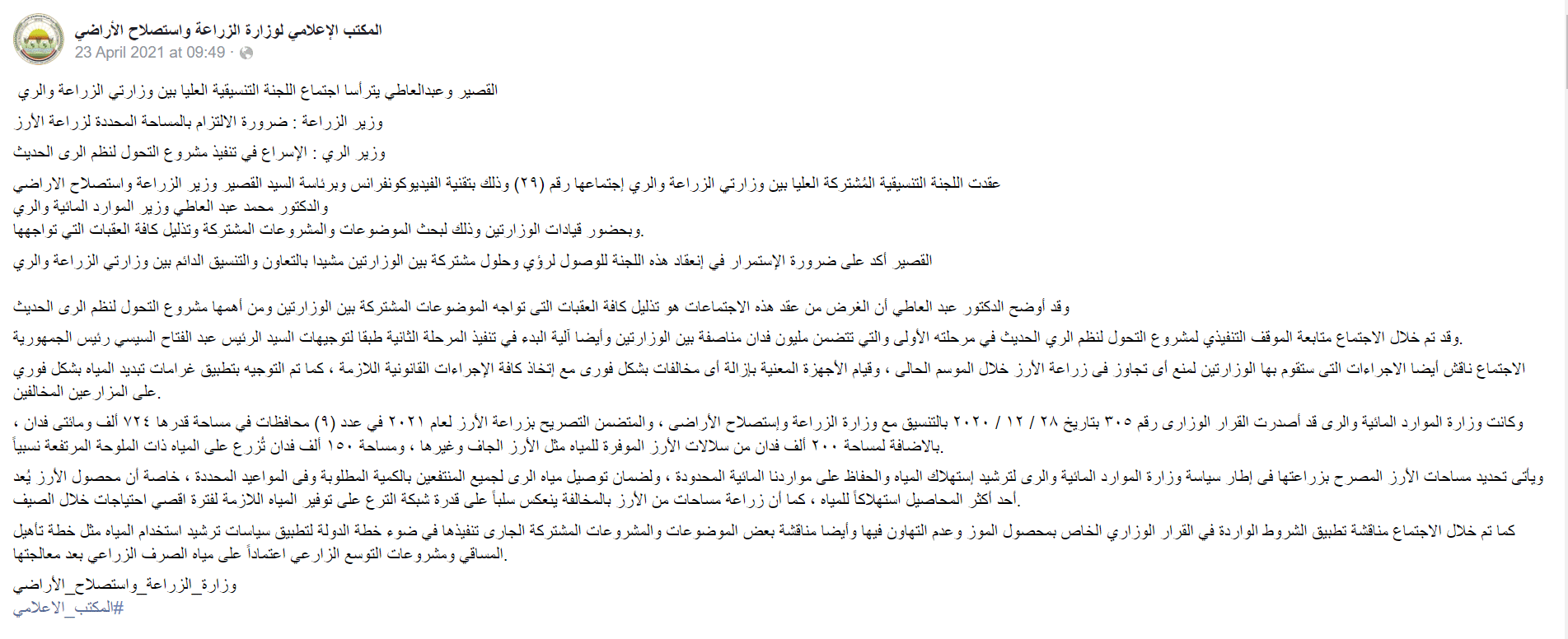 وهو ما دفعنا للبحث حول المساحة المنزرعة بالأرز عام 2021، وهو ما وصلنا إليه من خلال قرار وزارة الموارد المائية والري رقم 305 بتاريخ 28 ديسمبر 2020، والذي نص على زراعة ذات المساحة، وتم نشره في بيان على الصفحة الرسمية لوزارة الزراعة بـ "فيسبوك"، يوم 23 أبريل 2021.