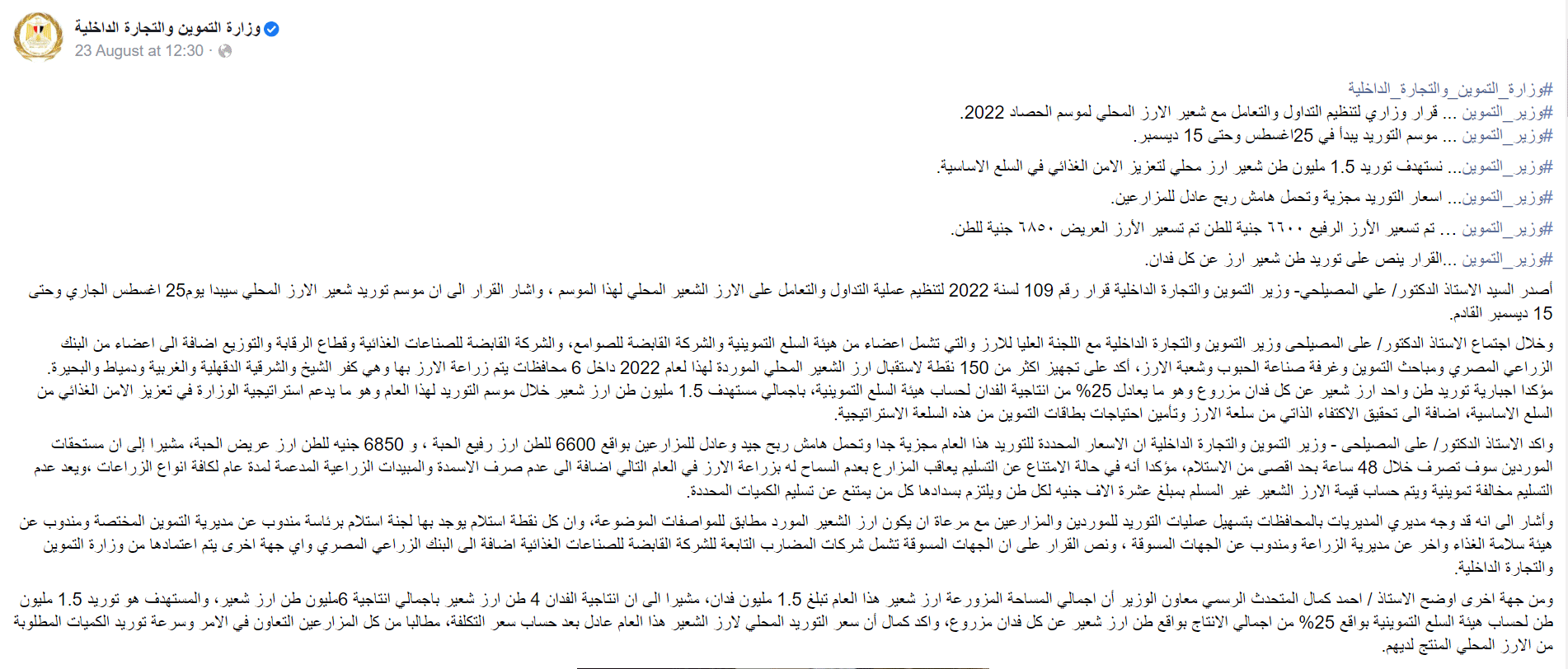 وهو ما ذكره مساعد الوزير أيضًا في 23 أغسطس 2022، عبر بيانٍ نُشر بالصفحة الرسمية بوزارة التموين والتجارة الداخلية على موقع التواصل الاجتماعي "فيسبوك".