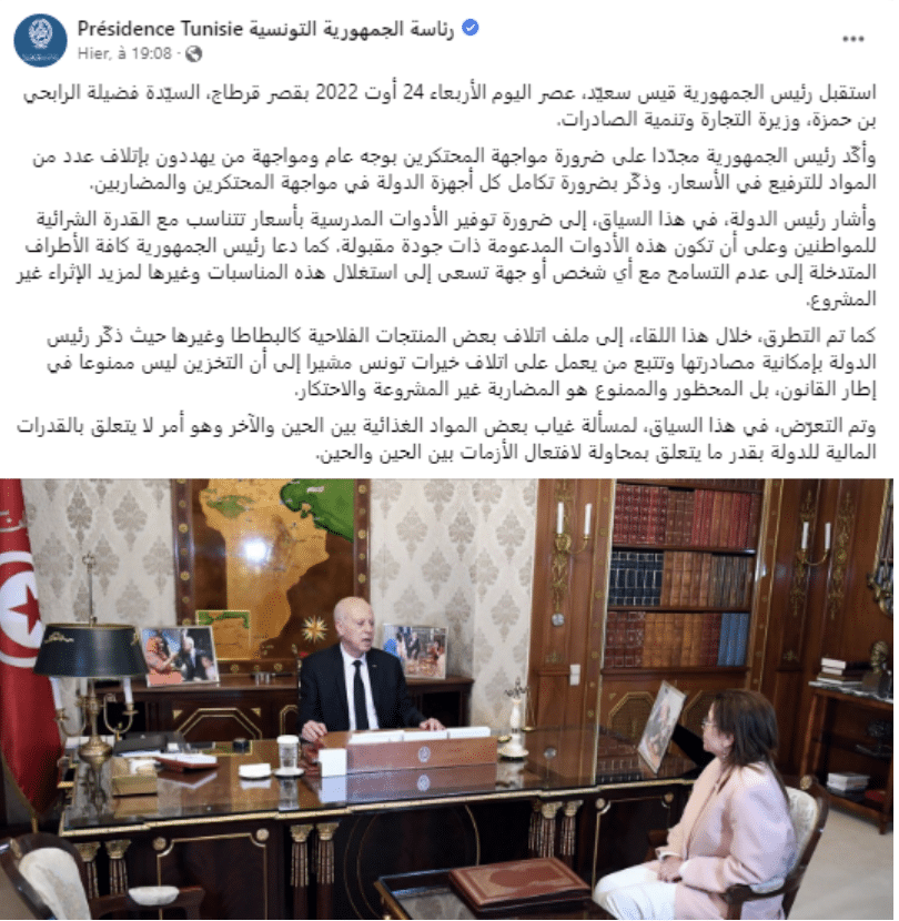 نشرت الصفحة الرسمية لرئاسة الجمهورية التونسية بيانًا يوم 24 أغسطس 2022، حول لقاء جمع الرئيس قيس سعيّد، بفضيلة الرابحي وزيرة التجارة وتنمية الصادرات، وقال الرئيس خلال اللقاء إن غياب بعض المواد الغذائية بين الحين والآخر لا يتعلق بالقدرات المالية للدولة لكن يتعلق بمحاولة احتكارية لافتعال الأزمات بين الحين والحين.