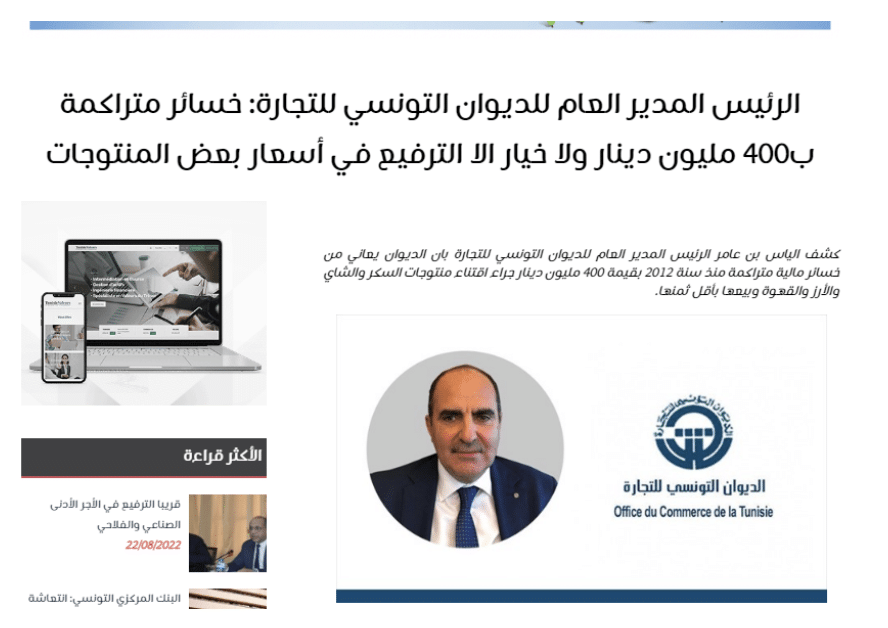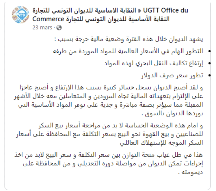 وحذرت صفحة النقابة الأساسية للديوان التونسي للتجارة يوم 23 مارس 2022، عبر تدوينة لها، من وضعية مالية حرجة للديوان، ومن تسجيل خسائر كبيرة بسبب ارتفاع الأسعار العالمية، وهو ما أصابه بالعجز عن الالتزام بتعهداته المالية تجاه المزودين والمتعاملين معه، ويؤثر بصفة مباشرة على توفر المواد الأساسية بالسوق.