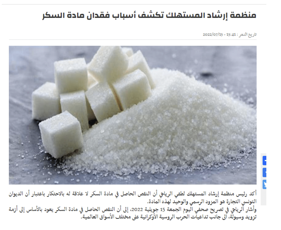 كما علق لطفي الرياحي، رئيس منظمة إرشاد المستهلك، في تصريح للصباح نيوز يوم 15 يوليو 2022، بإن النقص في السكر لا علاقة له بالاحتكار، حيث أن الديوان التونسي للتجارة هو المزود الرسمي والوحيد لهذه السلعة.