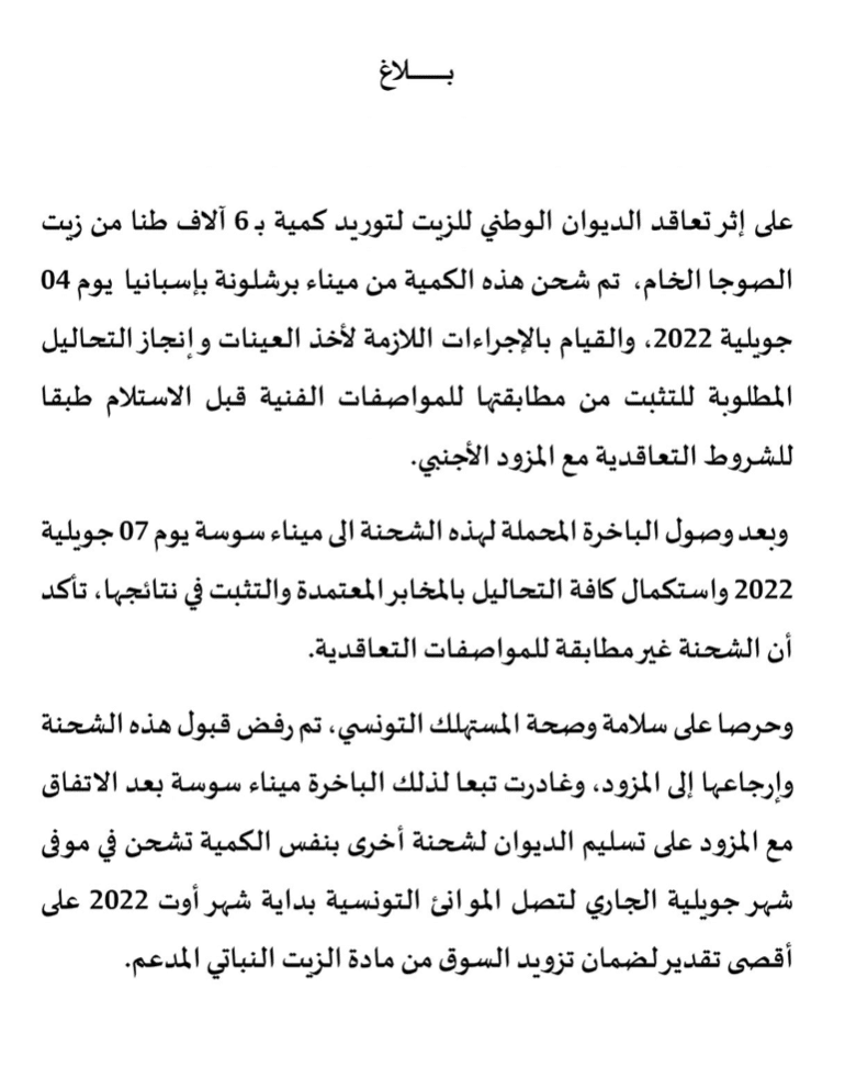 وكانت وزارة التجارة التونسية نشرت بيانًا على صفحتها في موقع فيسبوك يوم 21 يوليو 2022، أعلنت فيه أن الديوان الوطني للزيت تعاقد على توريد 6 آلاف طن من زيت الصوجا الخام، وبعد شحن الكميّة المطلوبة من ميناء برشلونة بإسبانيا يوم 4 يوليو وإجراء التحاليل المطلوبة للتأكد من مطابقتها للمواصفات الفنية قبل الاستلام، بعد وصول الباخرة المحملة بالشحنة إلى ميناء سوسة يوم 7 يوليو، تبين أنها غير مطابقة للمواصفات التعاقدية، فرفضتها، وغادرت الباخرة ميناء سوسة.