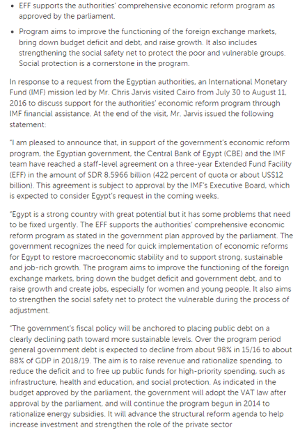 يذكر أنه في 11 أغسطس 2016، أعلن صندوق النقد الدولي أنه وصل إلى اتفاق على مستوى الموظفين بشأن تسهيل تمويل ممدد مدته 3 سنوات بقيمة 12 مليار دولارًا، موضحًا توصل الحكومة المصرية والبنك المركزي المصري وفريق صندوق النقد الدولي إلى اتفاق على مستوى الموظفين بشأن تسهيل الصندوق الممدد لمدة 3 سنوات بمبلغ 8.5966 مليارات وحدة حقوق سحب خاصة 422% من الحصة أو حوالي 12 مليار دولارًا. وأوضح أن الهدف من ذلك هو زيادة الإيرادات وترشيد الإنفاق لتقليل العجز وتحرير الأموال العامة للإنفاق ذي الأولوية العالية، مثل البنية التحتية والصحة والتعليم والحماية الاجتماعية، وكما هو مبين في الموازنة التي وافق عليها مجلس النواب، ستتبنى الحكومة قانون ضريبة القيمة المضافة بعد موافقة البرلمان، وسيواصل البرنامج الذي بدأ في 2014 لترشيد دعم الطاقة، وسيعمل على دفع أجندة الإصلاح الهيكلي للمساعدة في زيادة الاستثمار وتعزيز دور القطاع الخاص.