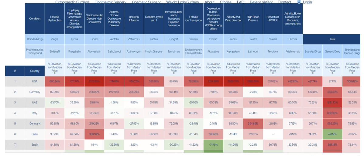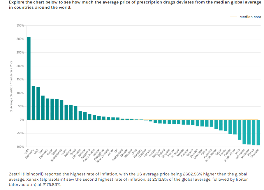 أما أعلى أسعار للأدوية في العالم وفقًا للمؤشر ذاته، فجاءت الولايات المتحدة في المرتبة الأولى، بزيادة تصل إلى 306.82% عن المتوسط العالمي، تليها ألمانيا بزيادة تصل إلى 125.64% عن المتوسط العالمي، والإمارات العربية المتحدة بزيادة تصل إلى 122.03% عن المتوسط العالمي، وإيطاليا بزيادة تصل إلى 90.36% عن المتوسط العالمي.