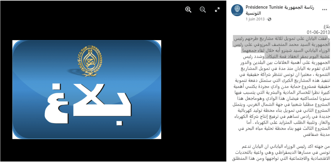 1 يونيو 2013.. بيان الرئاسة التونسية: اليابان تمول 3 مشروعات طرحهم المرزوقي منهم "محطة كهرباء رادس".