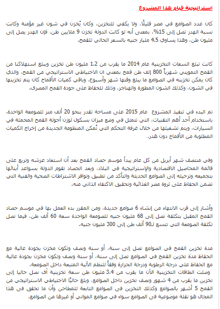 بيان المركز الإعلامي لرئاسة الوزراء - القمح ونشرت الهيئة العامة للاستعلامات، بيانًا يوم 2 يونيو 2022، ذكرت فيه أن الطاقات التخزينية للقـمح في الصوامع بلغت ما يقرب من 3.4 ملايين طن.