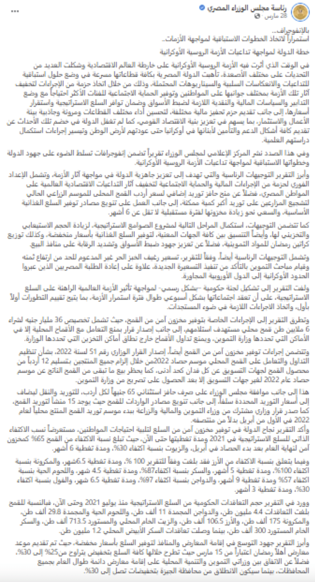 بيان المركز الإعلامي لرئاسة الوزراء - القمح