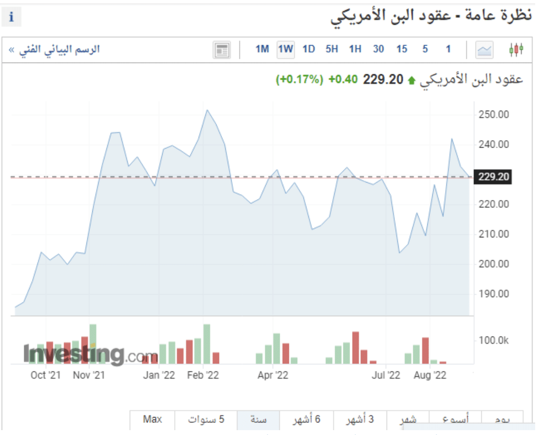 ويعرض الرسم البياني الثالث، حفاظ أسعار البن على ارتفاعها على الرغم من تذبذبها لتغلق البورصة أبوابها في آخر تاريخ يعرضه الرسم "6 سبتمبر 2022" بسعر 229.20 سنتًا للرطل الواحد.