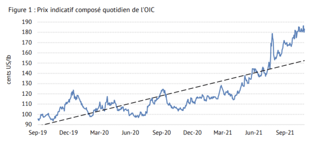 فيما يظهر رسمًا بيانيًا أرفق بالتقرير الصادر عن منظمة القهـوة، ارتفاع الأسعار من بداية عام 2020 إلى سبتمبر 2021 بنسبة بلغت 60% تقريبًا، حيث بلغ سعر الرطل الواحد من القهـوة في يناير 2020 100 سنت أمريكي وتجاوز 152 سنتًا بحلول سبتمبر 2021.