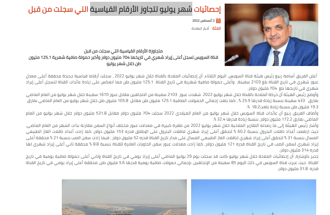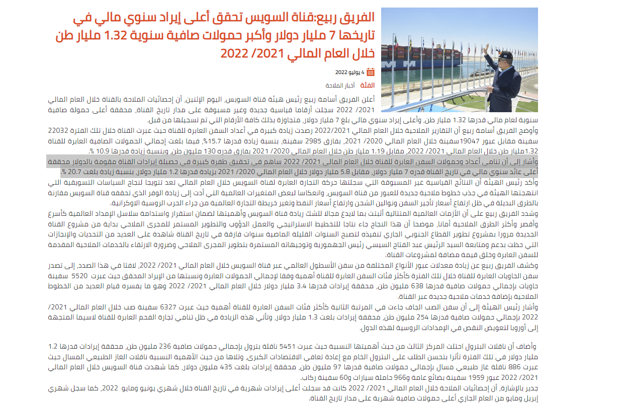 بتتبع تصريحات رئيس هيئة قنـاة السويس عثر فريق عملنا على تصريحات لـ ”ربيع“ نشرها الموقع الرسمي لهيئة القناة يوم يوم 4 يوليو 2022، أوضح خلالها أن إحصائيات الملاحة بالقناة خلال العام المالي 2021/ 2022 سجلت أرقاما قياسية جديدة وغير مسبوقة على مدار تاريخ القناة، محققة أعلى حمولة صافية سنوية لعام مالي قدرها 1.32 مليار طن، وأعلى إيراد سنوي مالي بلغ 7 مليار دولار، بنسبة زيادة بلغت 20.7 % عن العام السابق.