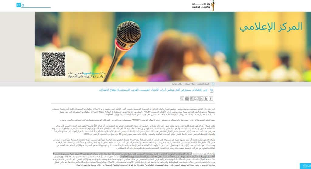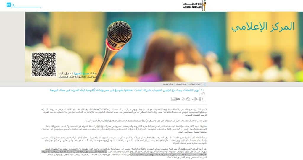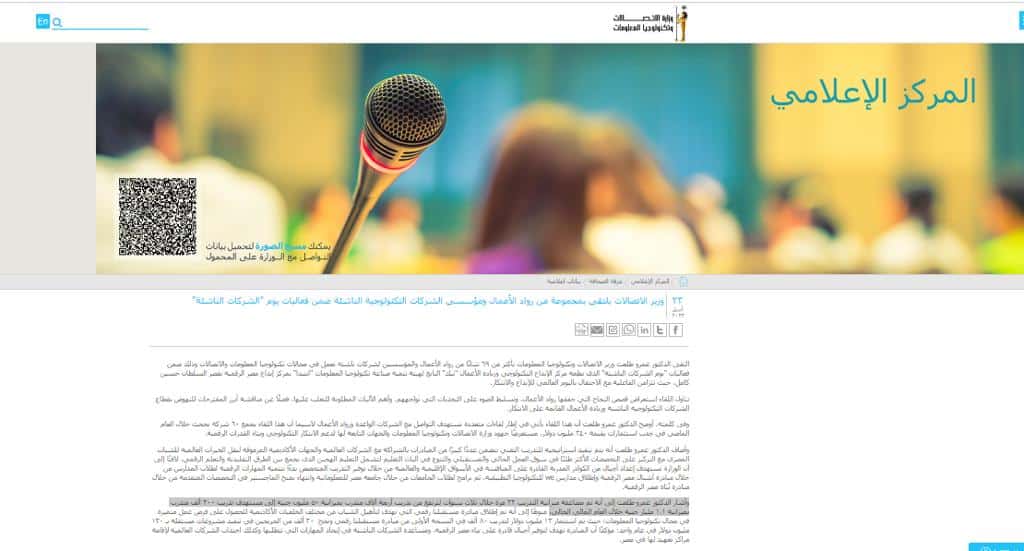 ونشر المركز الإعلامي لوزارة الاتصالات وتكنولوجيا المعلومات بيانًا، يوم 25 أكتوبر 2021، أوضح أن مضاعفة الاستثمار في برامج التدريب التقني 22 مرةً خلال 3 سنوات لترتفع من 50 مليون جنيهًا بمستهدف تدريب 4 آلاف شاب إلى 1.3 مليار جنيه بمستهدف تدريب 200 ألف شاب في مختلف علوم الاتصالات وتكنولوجيا المعلومات.