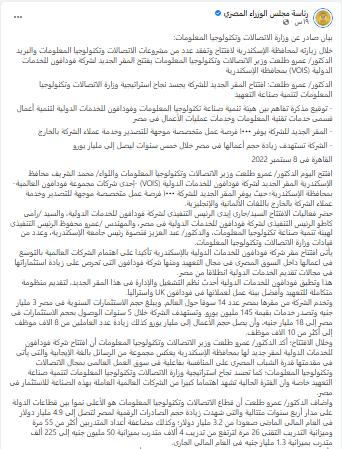 بيان وزارة الاتصالات وتكنولوجيا المعلومات كما نشر المركز الإعلامي لوزارة الاتصالات وتكنولوجيا المعلومات بيانًا آخر يوم 19 سبتمبر 2021، أوضح أن الوزارة ضاعفت ميزانية التدريب التقني 22 ضعفًا خلال 3 سنوات وارتفعت أعداد المتدربين من 4 آلاف متدرب في 2018 - 2019 بميزانية 50 مليون جنيهًا إلى 200 ألف متدرب بميزانية مليار و100 مليون جنيه.