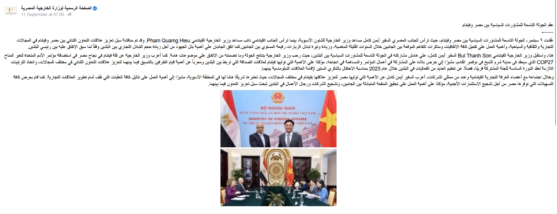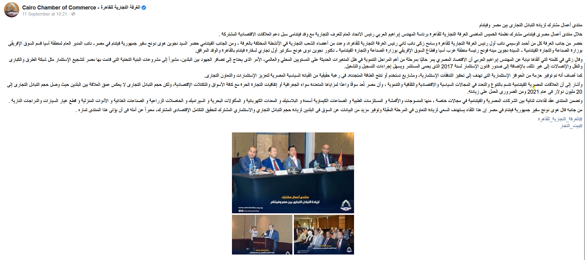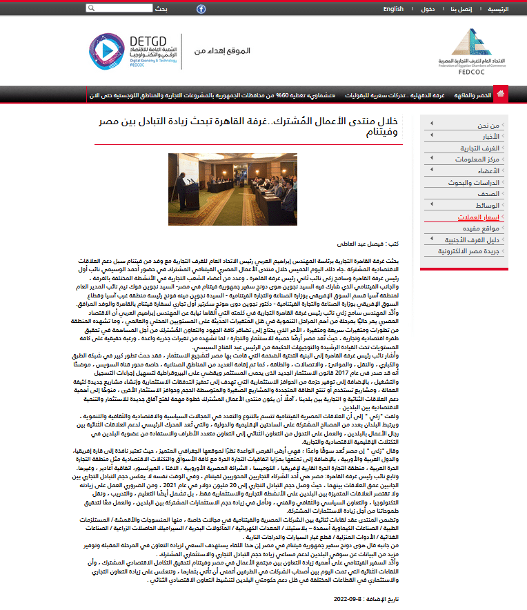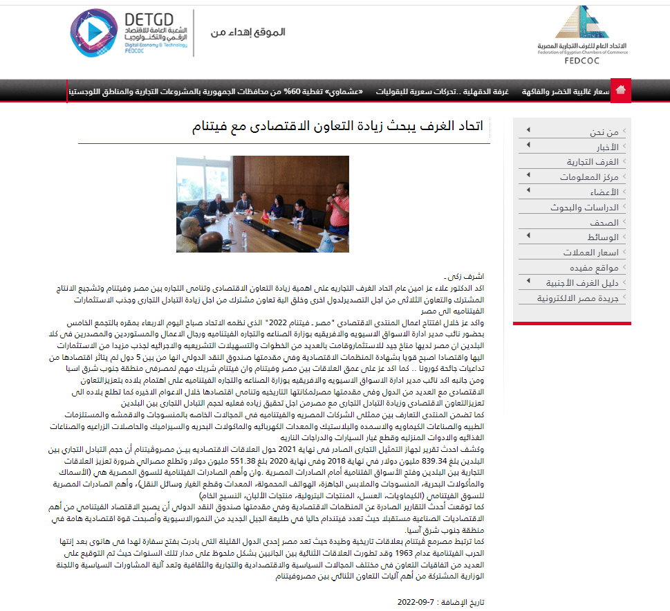 تصريحات نائب رئيس غرفة القاهرة التجارية وهو ما ذكره أيضًا يوم 8 سبتمبر 2022، حيث أكد نائب رئيس غرفة القاهرة التجارية، أن مصر هي أحد الشركاء التجاريين المحوريين لفيتنام، وفي الوقت نفسه لا يعكس حجم التبادل التجاري بين الجانبين عمق العلاقات بينهما، حيث وصل حجم التبادل التجاري إلى 20 مليون دولارًا في عام 2021، ونُشر ذلك عبر الموقع الرسمي للاتحاد العام للغرف التجارية المصرية.