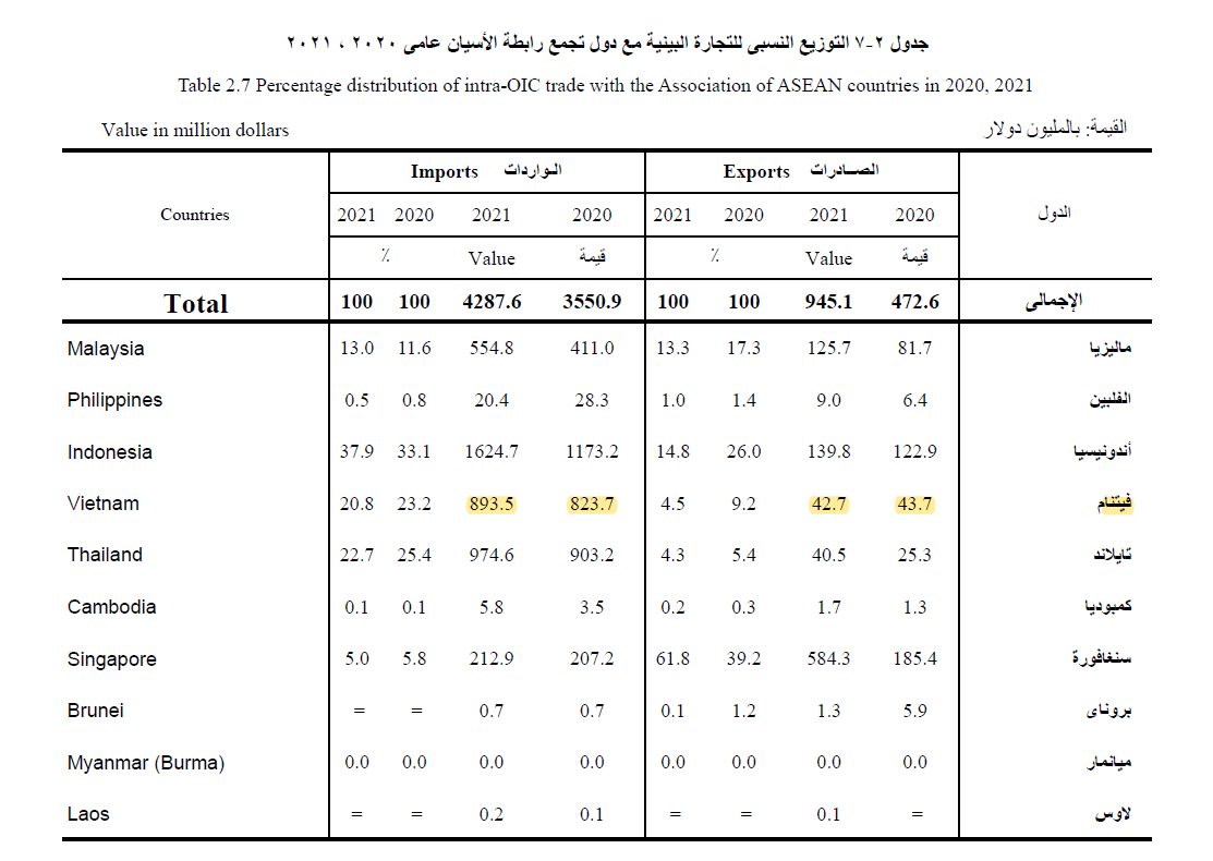 بيان الاتحاد العام للغرف التجارية المصرية ووفقًا لبيانات الجهاز المركزي للإحصاء تأتي دولة فيتنام ضمن دول تجمع رابطة الأسيان، والتي تتضمن "ماليزيا، والفلبين، واندونيسيا، وتايلاند، كمبوديا، وسنغافورة بروناي، وميانمار، ولاوس"، وتعتبر المجموعات السلعية الأعلى في الصادرات والواردات لها، هي المنتجات الحيوانية والنباتية والمشروبات والتبغ. بالإضافة إلى المنتجات الكيماوية والبلاستك ومجموعة المطاط والجلود والأخشاب والمواد النباتية والورق ومنتجاته، ومجموعة الخيوط والألياف النسيجية ومنتجات الغزل والنسيج والملابس، ومجموعة مصنوعات الرخام والأحجار والخزف والزجاج والمواد المماثلة ومجموعة المنتجات المعدنية، ومجموعة الآلات والأجهزة والآلية والكهربائية ومعدات النقل وأجزائها ومجموعة الأجهزة العلمية.