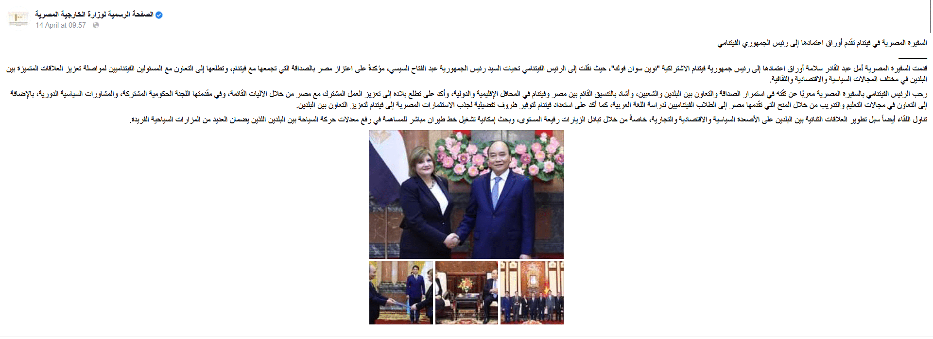 بيان الاتحاد العام للغرف التجارية المصرية وتأتي أهمية التحقق من الأرقام الواردة في التصريح، بسبب ما تسعى إليه مصر من تعزيز سبل علاقات التعاون الثنائي بين مصر وفيتنام في المجالات التجارية والثقافية والسياحية، وأهمية العمل على تفعيل الاتفاقيات ومذكرات التفاهم الموقعة بين الجانبين خِلال السنوات القليلة الماضية، وزيادة وتيرة تبادل الزيارات رفيعة المستوي بين الجانبين، وفقًا لبيان وزارة الخارجية يوم 11 سبتمبر 2022، بالإضافة لتأكيد الرئيس الفيتنامي استعداده لتوفير ظروف تفضيلية لجذب الاستثمارات المصرية لتعزيز التعاون بين البلدين.