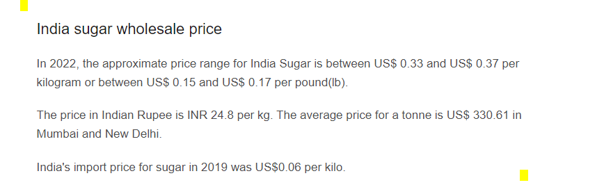 وزارة التجارة وتنمية الصادرات جلسة عمل وزارية وكشف مدير عام الديوان التونسي للتجارة، في حوار خص به موقع "أفريكان مانجر" يوم 13 سبتمبر 2022، أن معمل السكر بكل من ولايتي باجة وجندوبة يوفران حوالي 170 ألف طنًا سنويًا، بينما يتم توريد حوالي 200 ألف طن من السكر الأبيض من بعض البلدان على غرار الهند والبرازيل . وبالمزيد من التحري عن أسعار السكر في الهند، لمقارنتها بتصريحات مدير عام الديوان التونسي للتجارة، وجدنا أنه في عام 2022، يتراوح النطاق السعري التقريبي لشركة India Sugar بين 0.33 دولار أمريكي و0.37 دولار أمريكي للكيلو أو ما بين 0.15 دولار أمريكي و0.17 دولار أمريكي للرطل. وكان السعر بالروبية الهندية هو 24.8 روبيةً هنديةً للكيلو، ومتوسط سعر الطن هو 330.61 دولارًا أمريكيًا في مومباي ونيودلهي.