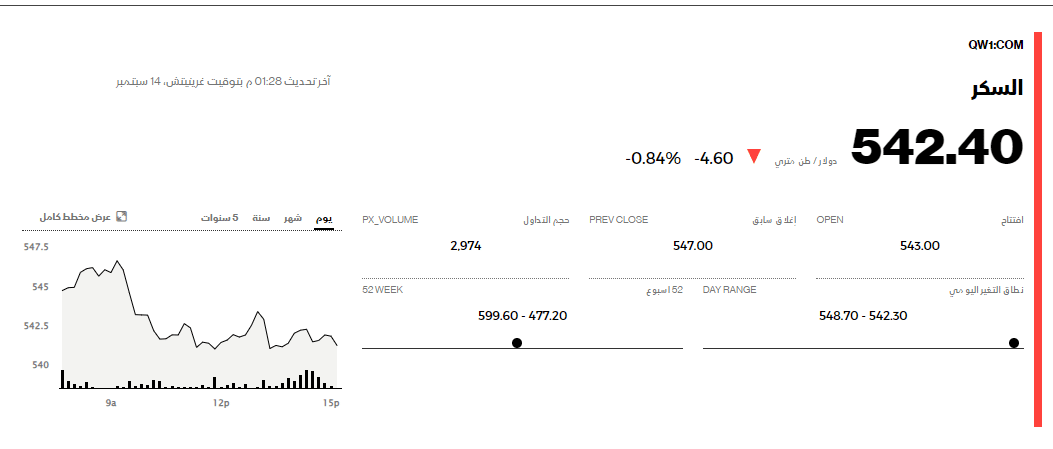 البورصة العالمية للسكر ووصلت أسعار السكر الأبيض في بورصة لندن حتى يوم 14 سبتمبر 2022 إلى 560.10 دولارًا للطن وفق موقع أسواق للمعلومات المتخصص في مجال المعلومات المالية والسلعية.