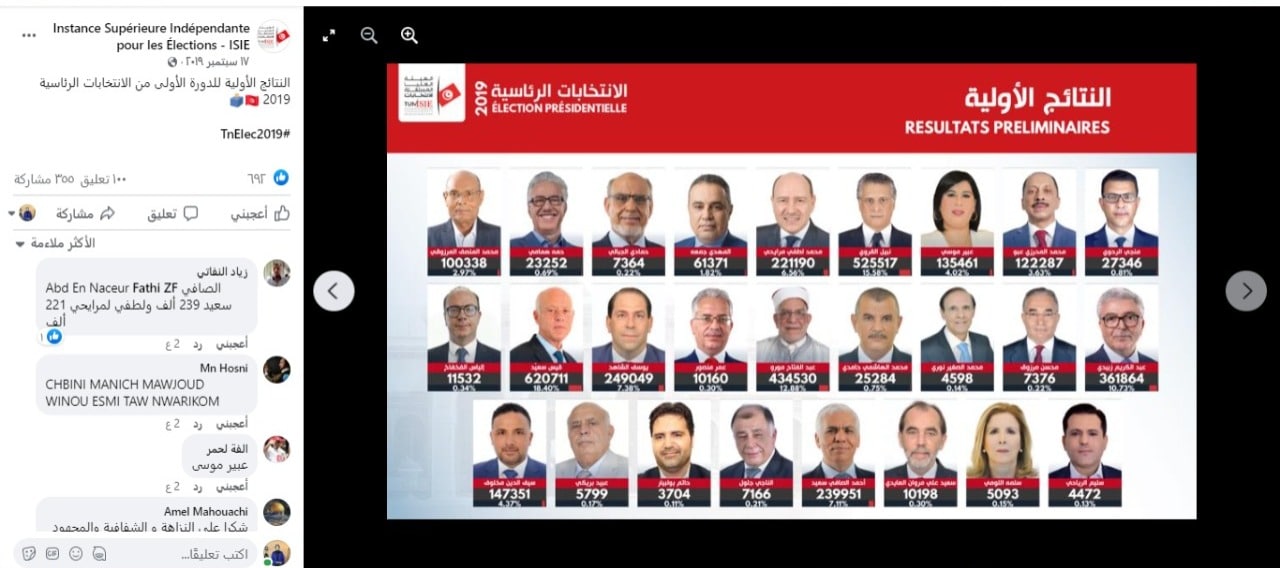 وكانت الهيئة العليا، أعلنت عن النتائج الأولية للدورة الأولى، يوم 17 سبتمبر 2019، أي بعد يومين من إجراء الانتخابات، وكانت قد نشرت النتائج على صفحتها على فيسبوك، وكذلك نشرت قرارها المتعلق بالتصريح بالنتائج الأوليّة للدورة الأولى للانتخابات الرئاسية 2019 على موقعها الرسمي، يوم 17 سبتمبر 2019.