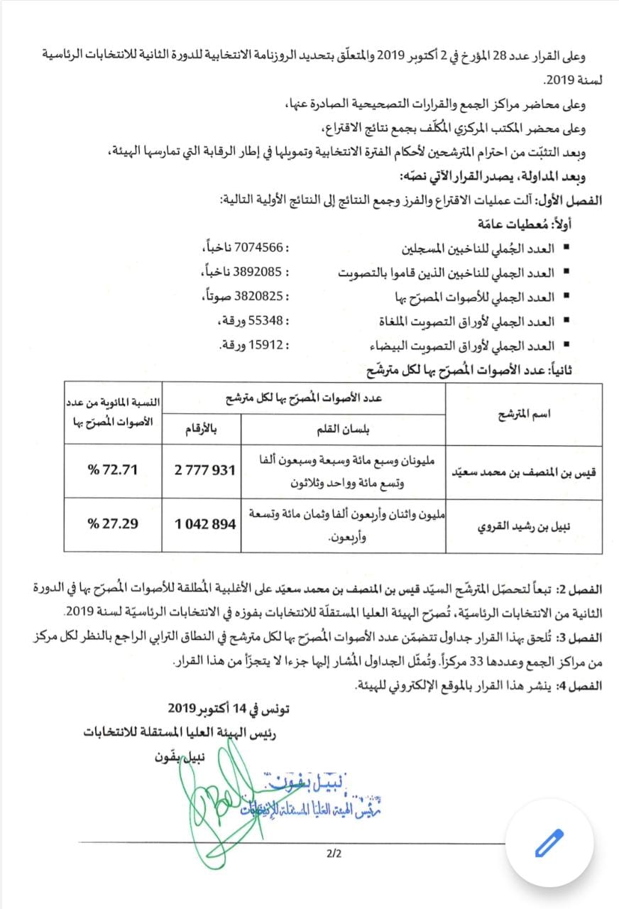 علنت النتائج الأولية للدورة الثانية في الساعة السادسة مساءً من يوم 14 أكتوبر 2019، بعد 24 ساعةً فقط من إغلاق صناديق الاقتراع، وفي الساعة الخامسة مساءً من اليوم التالي نشرت الهيئة قرارها حول النتائج الأولية على موقعها الرسمي، والتي أقرت بفوز قيس سعيّد برئاسة الجمهورية التونسية، كما هو موضّح في القرار التالي: