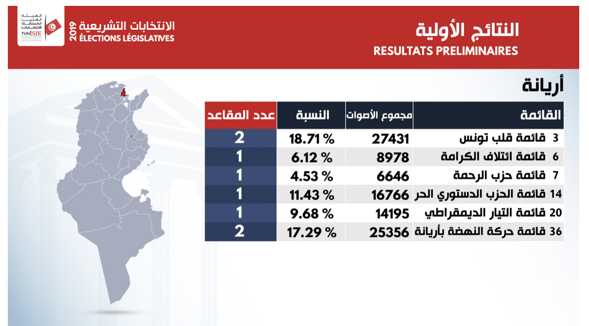 عقدت الانتخابات التشريعية يوم 6 أكتوبر 2019، وأعُلنت نتائجها بالتتابع، إذ أعلنت الهيئة عن نتائج حينية يوم 7 أكتوبر 2019، ونتائج حينية أخرى يوم 8 أكتوبر 2019، ليتم الإعلان عن النتائج الأولية يوم 9 أكتوبر 2019، أي بعد يومين من إجراء الانتخابات.