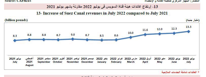 ذكر الموقع الرسمي للجهاز المركزي للتعبئة العامة والإحصاء المصري، تحت عنوان "إحصاءات تحت المجهر"، أن عائدات قناة السويس خلال شهر يوليو الماضي بلغت 13.3 مليار دولارًا.