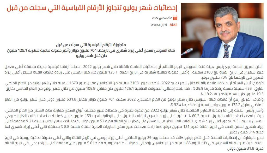 النشرة الإحصائية الشهرية – أغسطس 2022 ويتوافق ما ذُكر في بيانات النشرة الشهرية، مع ما أعلنه الفريق أسامة ربيع، رئيس هيئة قناة السويس، يوم 2 أغسطس 2022، من أن عائدات القناة ارتفعت لتسجل أعلى إيراد شهري في تاريخها وبلغت 704 ملايين دولار أي نحو 13.3 مليار جنيهًا وفقًا لمتوسط سعر صرف الجنيه مقابل الدولار في يوليو 2022.