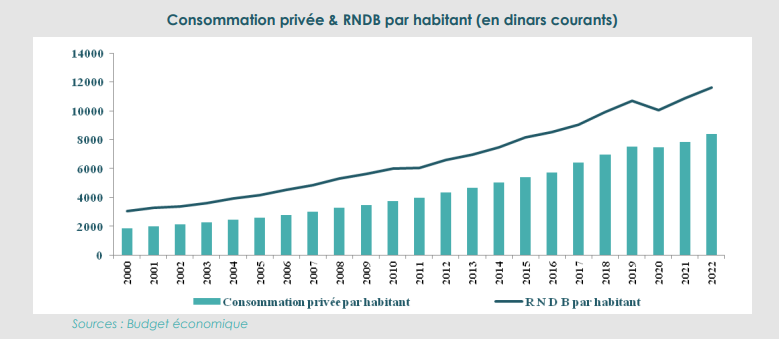 الاستهلاك الخاصّ ونموّ النّاتج المحلّي الإجمالي المتاح للساكن (بالدينار)
