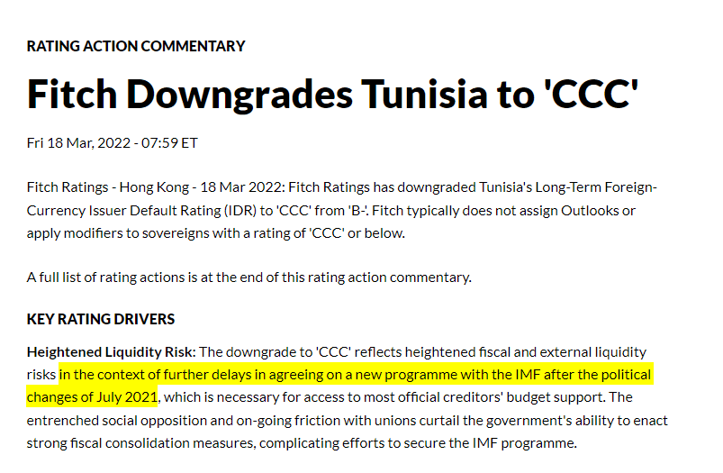 وأعلنت "فيتش رايتنجس" ((Fitch Ratings في مارس 2022، عن خفض التصنيف السيادي لتونس من B- إلى CCC، مع آفاق سلبية، وذلك في سياق تأخّر اتفاقها مع صندوق النقد الدولي بشأن برنامج جديد، على حدّ تعبير الوكالة.