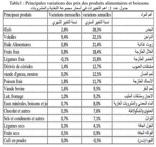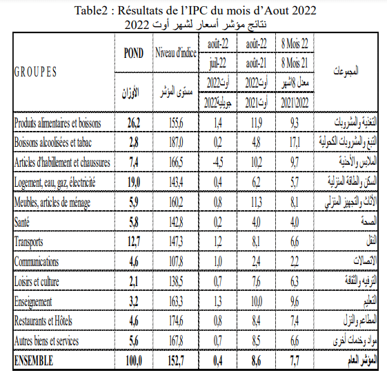 وفي ذات الصدد، رصد المعهد الوطني للإحصاء، في مسح أجراه في شهر أغسطس 2022، ارتفاعًا في مؤشّر أسعار الاستهلاك العائلي بنسبة 0.4% بعد 1% في يوليو و0.7 %في يونيو من ذات العام، وذلك كحصيلة للتغييرات المُسجّلة في أسعار الأغذية والمشروبات بنسبة عامّة قُدّرت بـ1.4%، والتّي شملت زيادات شهريّة في أسعار لحم الدواجن بنسبة 9,4% والبيض بـ2,8% والأسماك بـ1,8% ولحم البقر بـ1,6% والماء المعدني والمشروبات الغازيّة بـ0.7% وأيضًا أسعار مشتقّات الحبوب بـ1,4%.